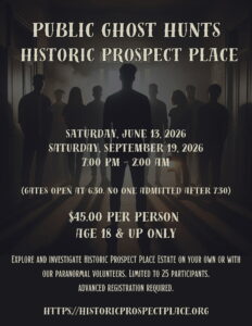 Funds generated from ghost hunting events are used exclusively for preservation of Historic Prospect Place Estate. Historic Prospect Place Estate is owned and operated by the G.W. Adams Educational Center; an all-volunteer, Ohio-registered 501(c)(3) nonprofit organization. ALL DONATIONS ARE NON-REFUNDABLE.