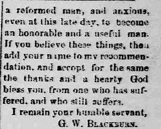 In 1864 Blackburn was once again arrested for burglary, but escaped the confines of a jail in Newark. He once again fell into the clutches of the law in 1866, when he and two other individuals attempted to rob Ruben Porter of Morgan County. Ruben Porter fought back and nearly chopped Blackburn’s arm off with an axe during the altercation. Unfortunately Mr. Porter succumbed to his injuries shortly after the attack and Blackburn and his accomplices were quickly apprehended. Ironically, Blackburn was never tried on the charge of murder. It was stated in court that Blackburn’s accomplices were the attackers and that he never struck Mr. Porter during the altercation. Blackburn was sentenced to ten-years at the Ohio State Penitentiary but was later released by an order of the Ohio Supreme Court in 1873. This didn’t stop Blackburn from continuing his life of crime.