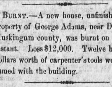 The story passed down over the years is that George Blackburn burned down the mansion, days before G.W. Adams was scheduled to move-in with his family. Word supposedly reached G.W., identifying Blackburn as the culprit and Mr. Adams has him locked up in the Ohio State Penitentiary. The motive for the arson; wanting to make more work for himself. As the story goes, Blackburn eventually escapes prison and returns to the Dresden area where he meets his demise at the hands of a farmer… and the business-end of an axe, presumably during an act of theft. Many of the details noted above appear to be drawn from a 1967 Coshocton Tribune article and seem to be the premise of the stories and legends that have survived into the modern era.